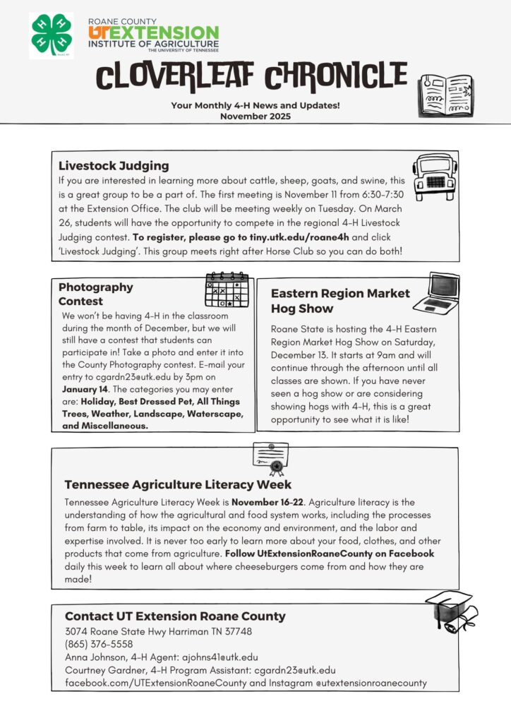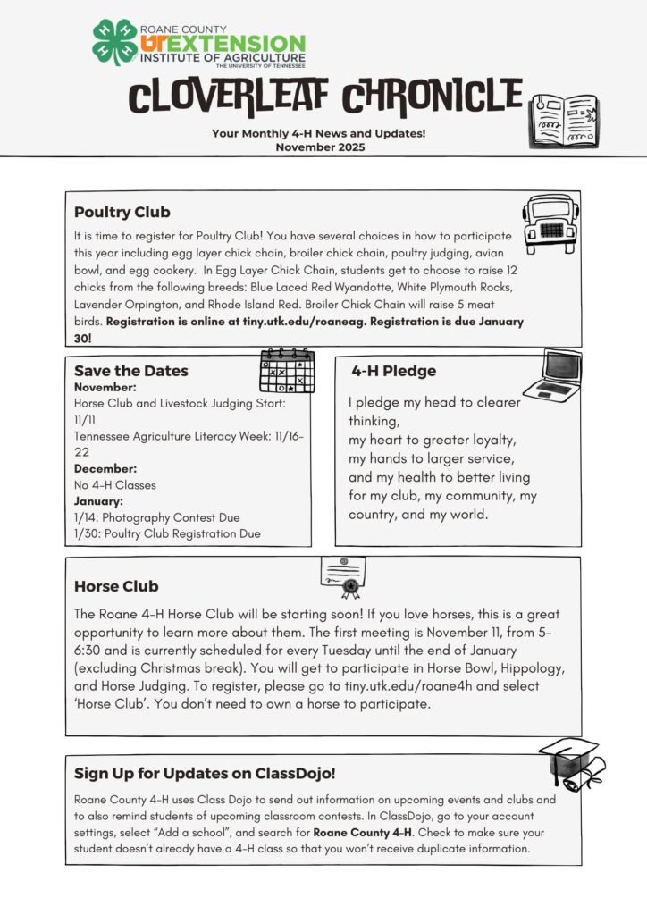 Tennessee is lucky to be one of the few states that welcome 4-H clubs within the school day. This partnership works because 4-H Extension Agents across the state work hard to develop meaningful, exciting, standard-aligned lessons for in-school clubs. Roane County 4-H Clubs are offered during the school day to students at no cost.